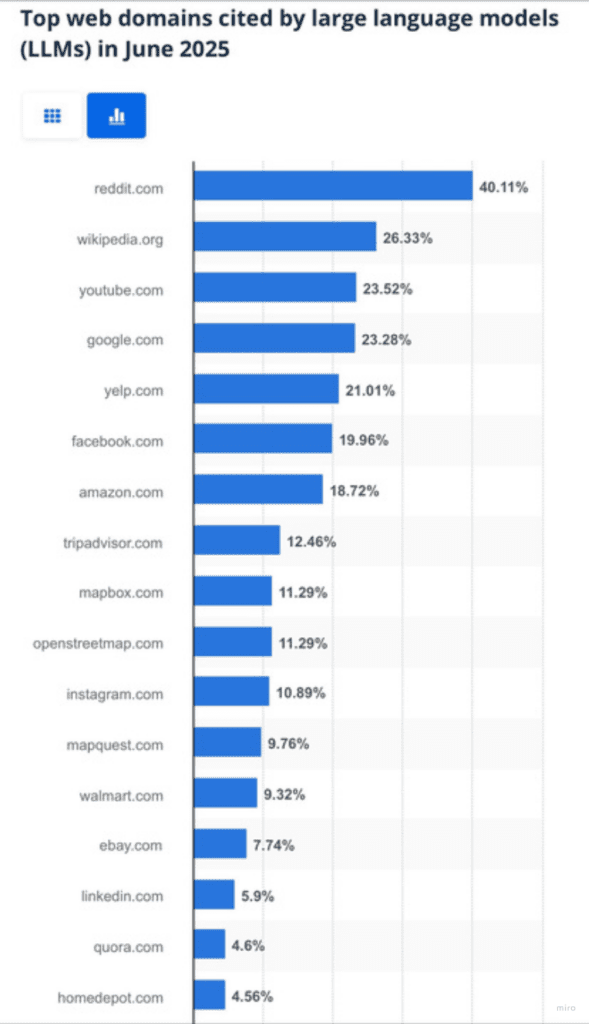 From an AI search perspective, Reddit dominates citation inclusion across major LLMs (ChatGPT, Perplexity, Claude, etc.). According to Statistica data from June 2024, Reddit accounts for 40% of all web domain citations by language models. For Google AI Overviews specifically, Reddit ranks #2 in citation frequency, just behind Quora.